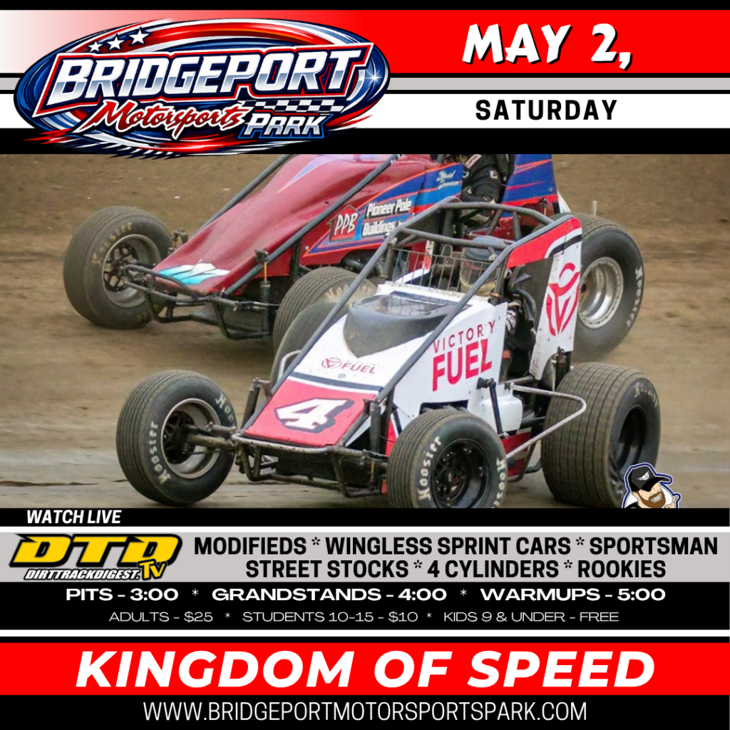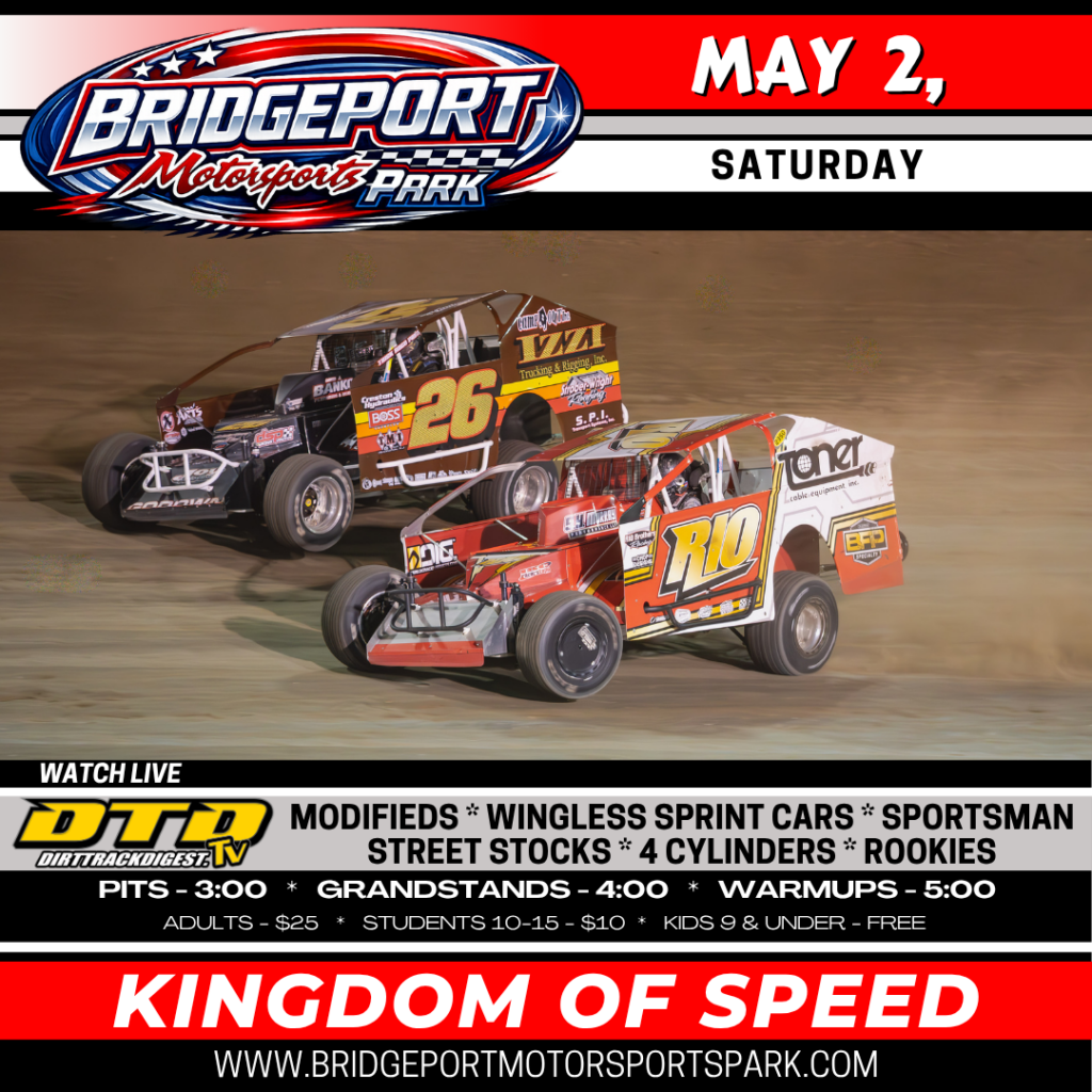 The Bridgeport Motorsports Park threw the green flag on the 2026 season with a full pit of Modifieds (39) and Sportsman (53) for the Prelude to the Doug Hoffman Memorial race. Mike Maresca raced to his second Bridgeport season opener in the Modified twenty-five lap feature. Joe Toth won both the twenty lap Sportsman main event and the rained-out Harry’s U-Pull-It 100 Lap Sportsman Nationals $10,000 Not to Win feature event from last season. Jonathan Swanson raced to the win in the season opener for the Victory Fuel Wingless Sprints.